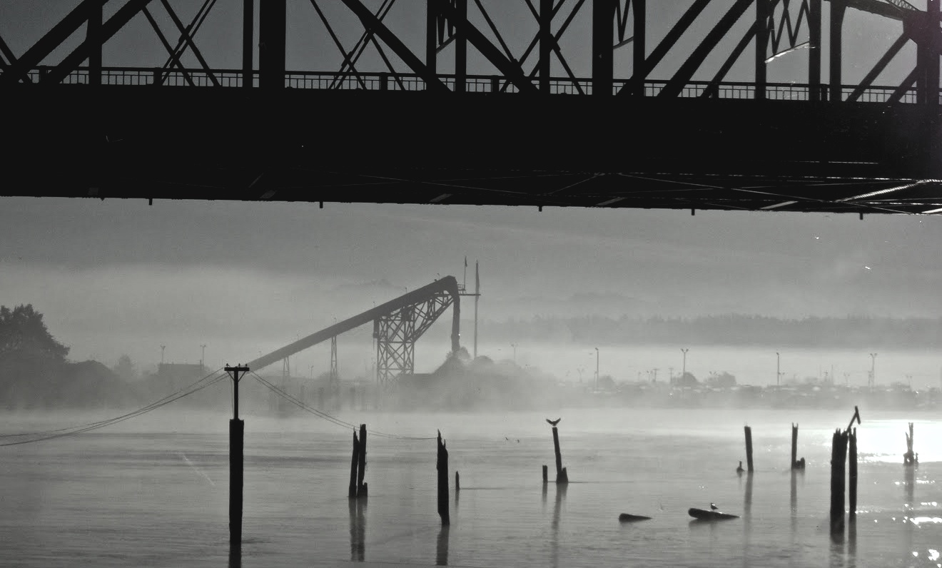 Rusted bridges, grain elevators.