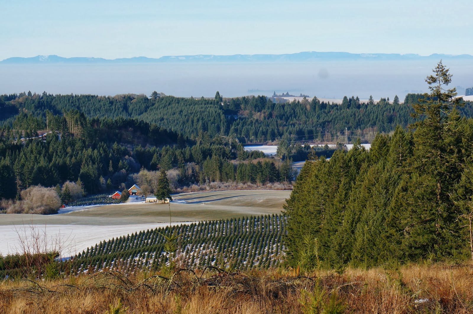 This happens in Oregon’s Willamette Valley from time to time. It’s called freezing fog, and it crystalizes every speck of moisture in the air. The picture below shows that layer of fog. And the ones below that, the magic it creates.