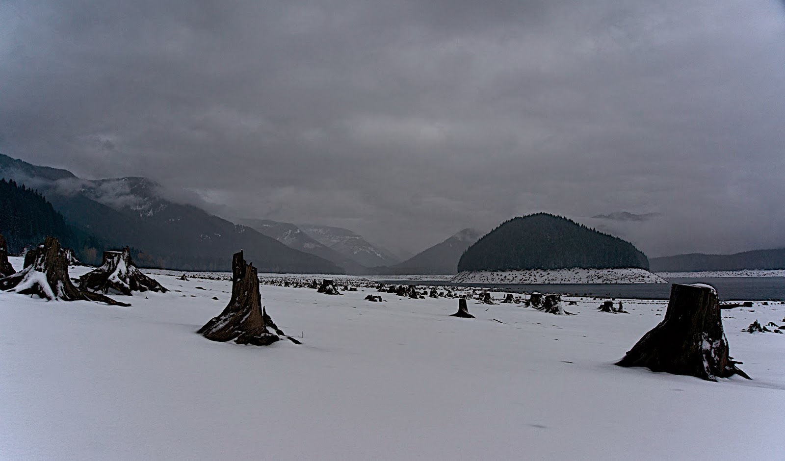In winter, though, the 455,000 acre-foot lake is drained to make room for snow melt and runoff. In other words, instead of a reservoir, what one can see at Detroit Lake now is the old channel of the North Santiam river, and the remnants of a forest that once stood at its side. It’s a surreal landscape of still water and old growth stumps poking through the freezing earth like tombstones.
