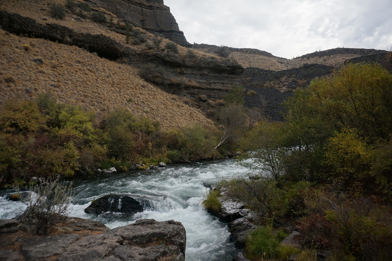Yesterday, Waldo and I took what I think is the best autumn hike I have ever had. Maybe it was the weather, warm, yet overcast. Maybe it was my mood—happy to be out hiking after a 13 day hiatus. I returned from my Grand Canyon Rim to Rim hike less than two weeks ago, but in between there was a trip to Chicago for my Dad’s memorial, and as usual, it takes me time to get the energy to leave home after I have been gone. Particularly after the Chicago trip. There was so much to process, so many emotions to hold, and goodbyes to say. So, it was probably all that that helped make my hike special—it was a quiet respite, a grounding walk among the bluffs and buttes of Oregon’s High Desert.